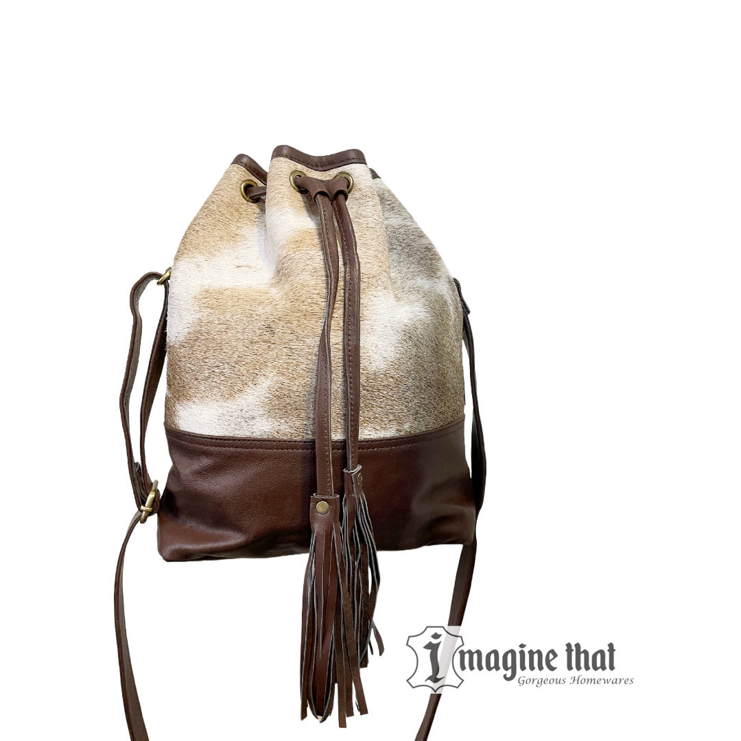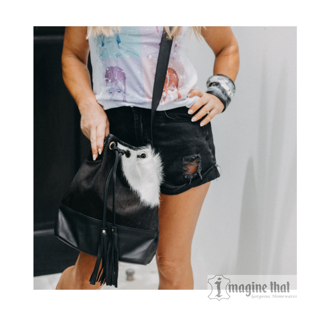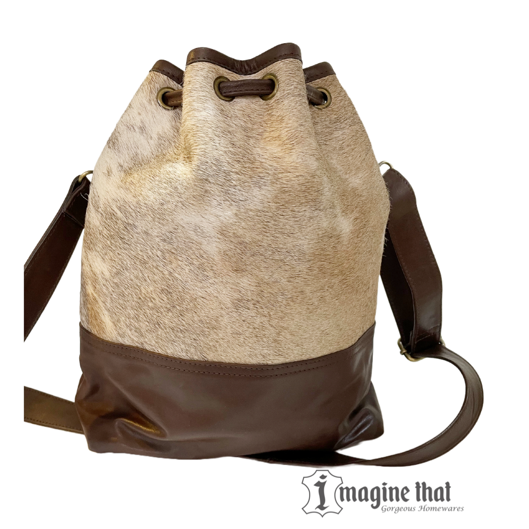 This beautifully crafted handbag is made from genuine cowhide and leather designed to last. Functional with its roomy interior, drawstring fastening with fashionable tassle and adjustable strap to wear cross body style. A perfectly sized and stylish bag for all your daily companions.