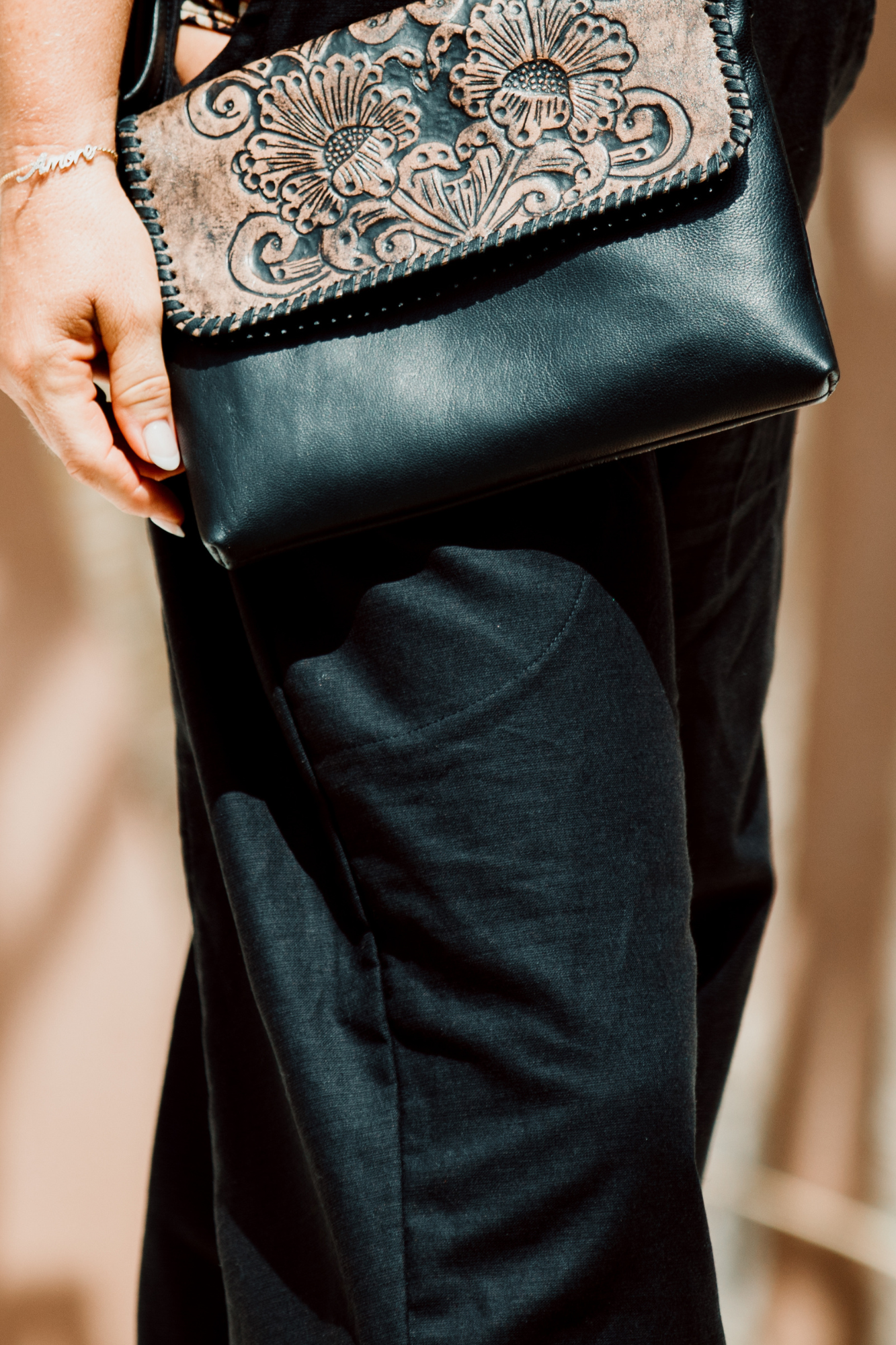 The perfect size bag in leather with embossed floral design will make the ideal companion during day or night for all those essentials such as phone, keys and sunglasses.
